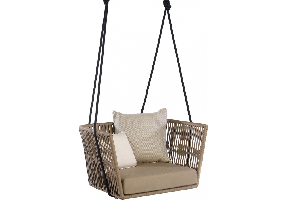 Bitta designed by Rodolfo Dordoni for Kettal is a suspended armchair with a painted aluminum structure. The body is entirely covered in synthetic rope with padded cushions and upholstered in fabric suitable for outdoor use. Bitta is available in different finishes.