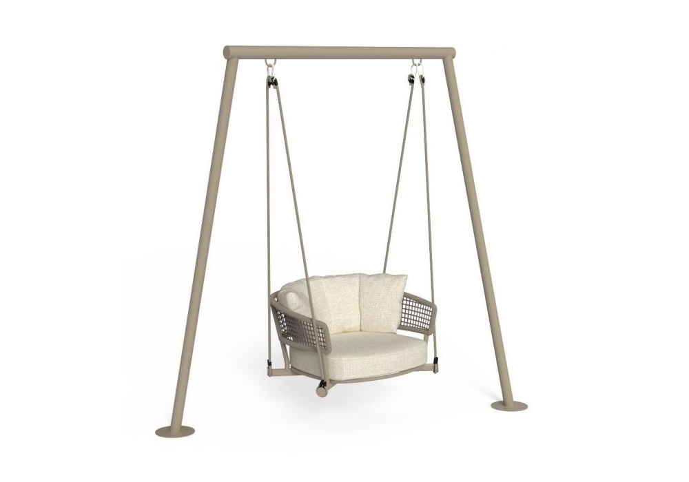 Moon Alu designed by Cristian Visentin for Talenti is a swing, with aluminum support structure, rope seat and cushions with dry foam padding, removable covers. Available in different finishes.