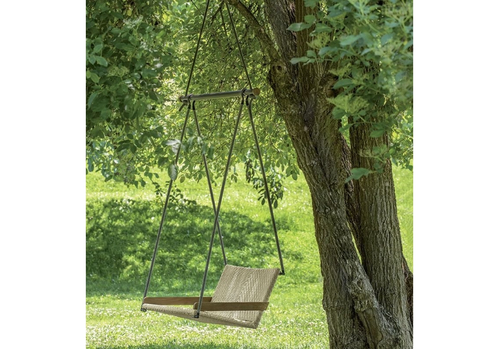 Allaperto Nautic designed by Matteo Thun, Antonio Rodriguez for Ethimo is a suspended seat structured in teak wood and metal with rope covering. Allaperto Nautic is also available with cushions in different finishes.