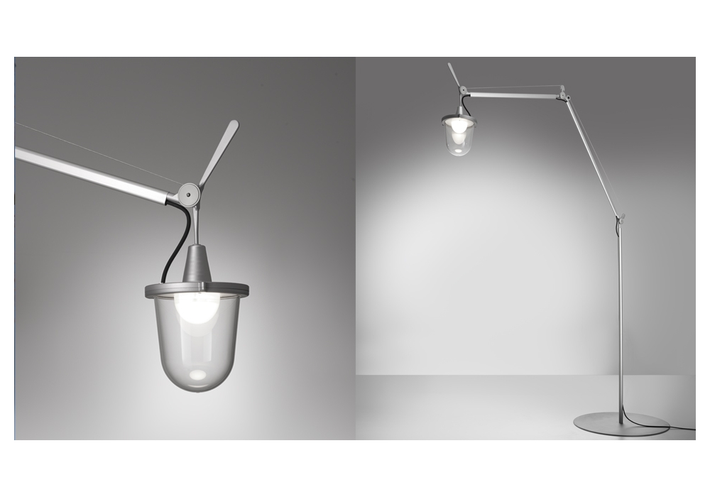 Tolomeo Lampione designed by Michele De Lucchi & Giancarlo Fassina for Artemide is an outdoor floor lamp with circular base and movable arms in aluminum and steel. The head is adjustable and adopts an LED light source protected by a high-resistance plastic cap.