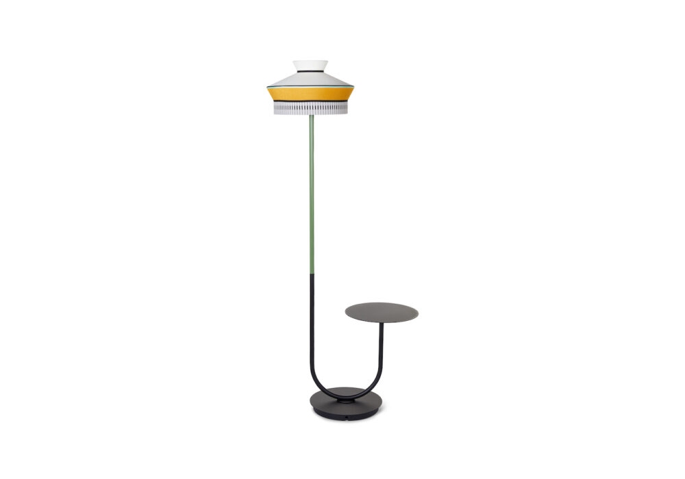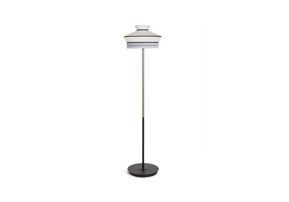 Calypso designed by Servomuto for Contardi is an outdoor floor lamp with circular base and vertical brass rod with a matt black lower part and reseda green upper part. The lampshade is made of circular fabric and adopts a light source with an E27 LED socket. Calypso is available in a version with or without a table and different lampshade models and finishes.