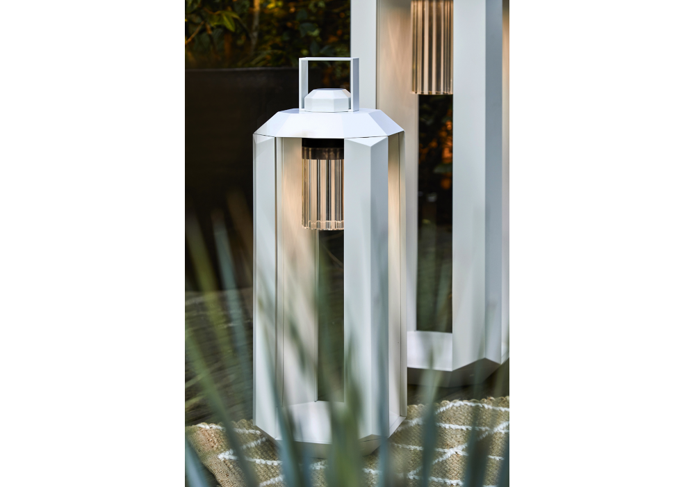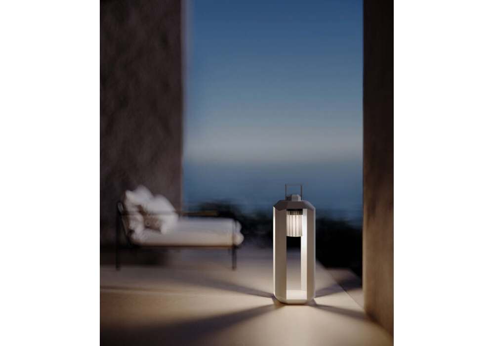 Cube Nomad designed by Massimiliano Raggi for Contardi is a rechargeable outdoor lamp with a structure available in dark bronze and matte white finishes. It turns on automatically by rotating the battery, which is easily removable for charging via USB-C. The diffuser is made of transparent ribbed plexiglass, has a battery life of up to 10 hours, and recharges in 6–8 hours. Also available in a mini size.