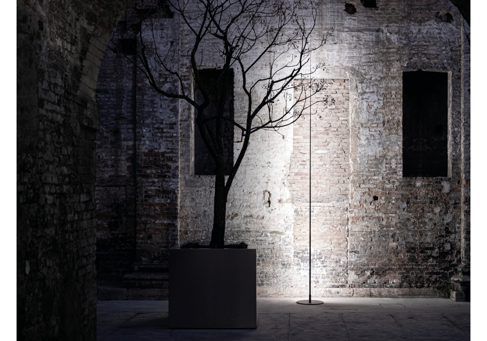 Origine Outdoor designed by Davide Groppi and Giorgio Rava is an outdoor floor lamp with circular metal base and vertical rod in matt black fiberglass. The light source is dimmable LED in different gradations of light.