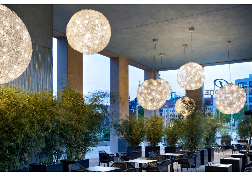 Fil de Fer firmata da Enzo Catellani per Catellani&Smith è una lampada a sospensione outdoor a forma di sfera, in filo d'alluminio naturale con base in metallo cromato. Disponibile in diverse dimensioni.