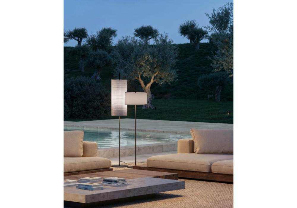 Lagoon designed by Servomuto for Contardi is an outdoor floor lamp with circular base and vertical structure in matt black lacquered metal. The circular fabric lampshade shields a light source with an E27 LED socket. Lagoon is available in different models and lampshade finishes.