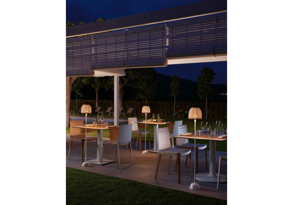 Atticus Bover designed by Joana Bover for Bover is an outdoor floor lamp with circular base in aluminum and vertical rod in painted stainless steel. The lampshade is structured with a synthetic fiber weave with a polyethylene diffuser and shields a LED-type light source with on/off switch. Atticus is available in different finishes and versions.