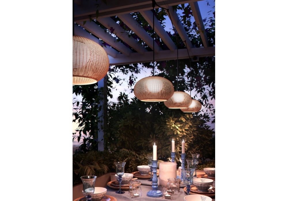 Garota designed by Alex Fernández Camps and Gonzalo Milà for Bover is an outdoor pendant lamp with metal support and black neoprene suspension cable. The lampshade is rounded in synthetic fiber and shields a LED type light source with Triac dimmer system. Garota is available in different finishes.