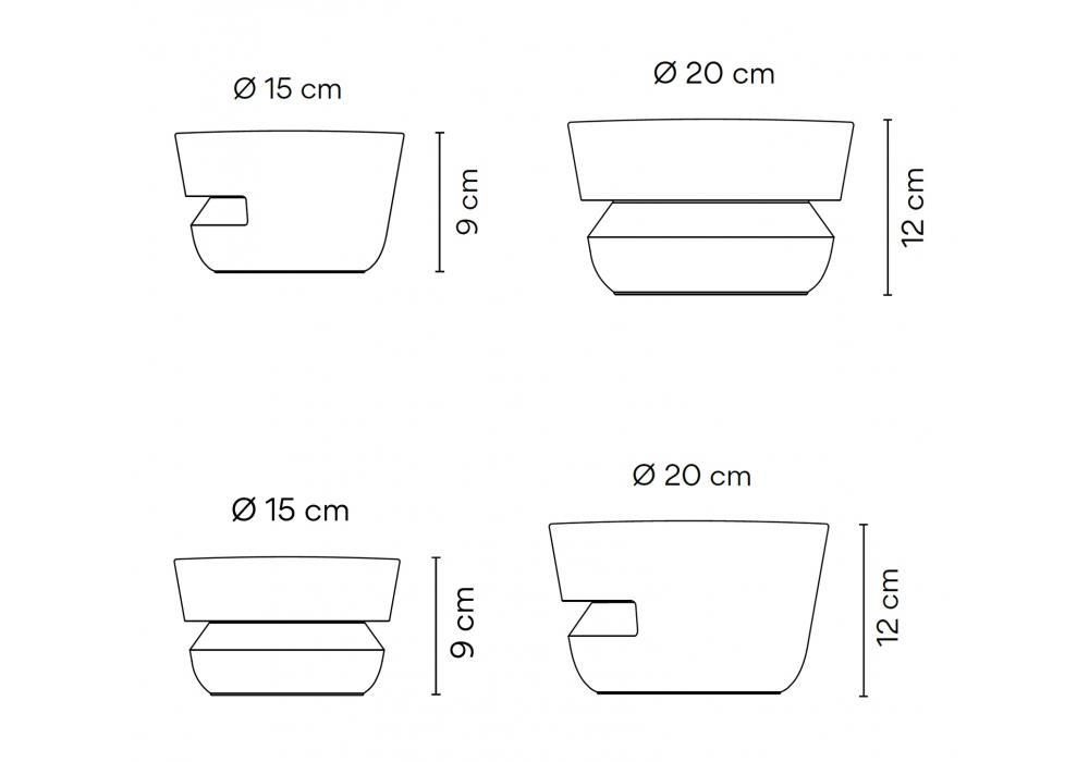 | Dimensions | Ø 15 x H 9 cm; Ø 15 x H 9 cm; Ø 20 x H 12 cm; Ø 20 x H 12 cm. |