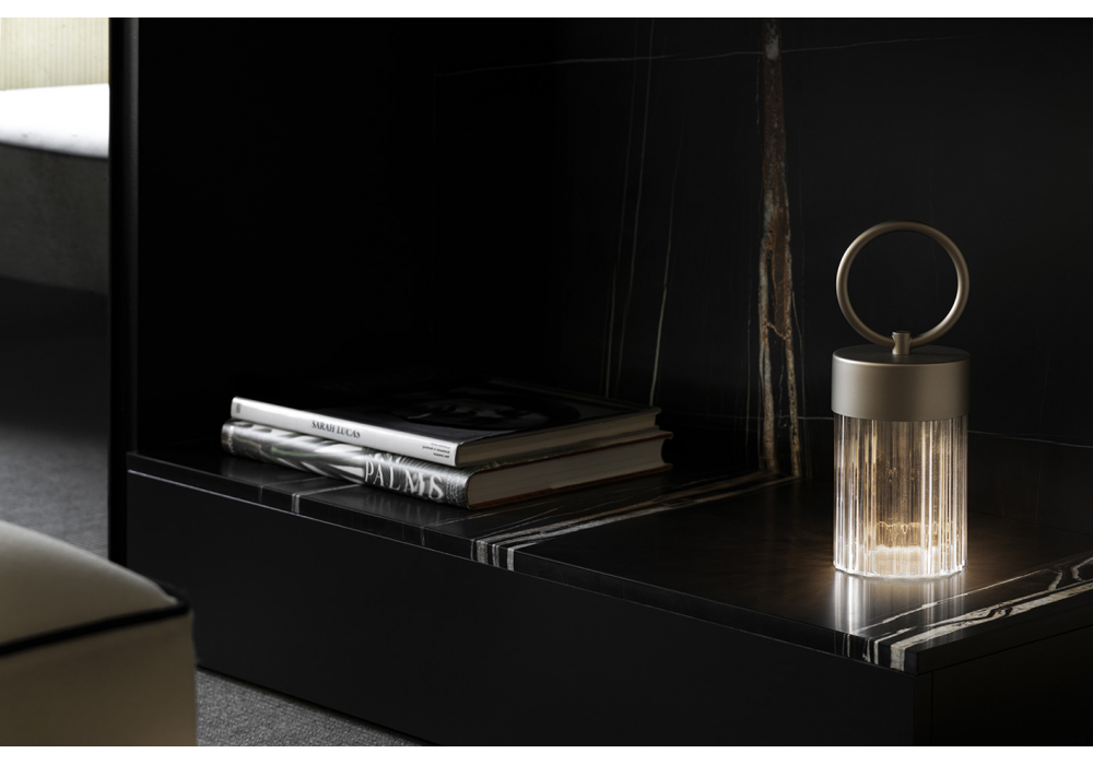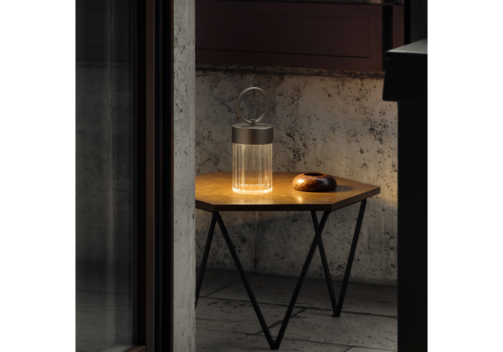 Claretta designed by Chiara Caberlon for Contardi is a rechargeable outdoor lamp with a metal frame in various finishes. The shade is made of clear ribbed plexiglass, and the battery life is up to 10 hours, with a 6–8-hour charge. USB Type-C cable included; power supply not included.