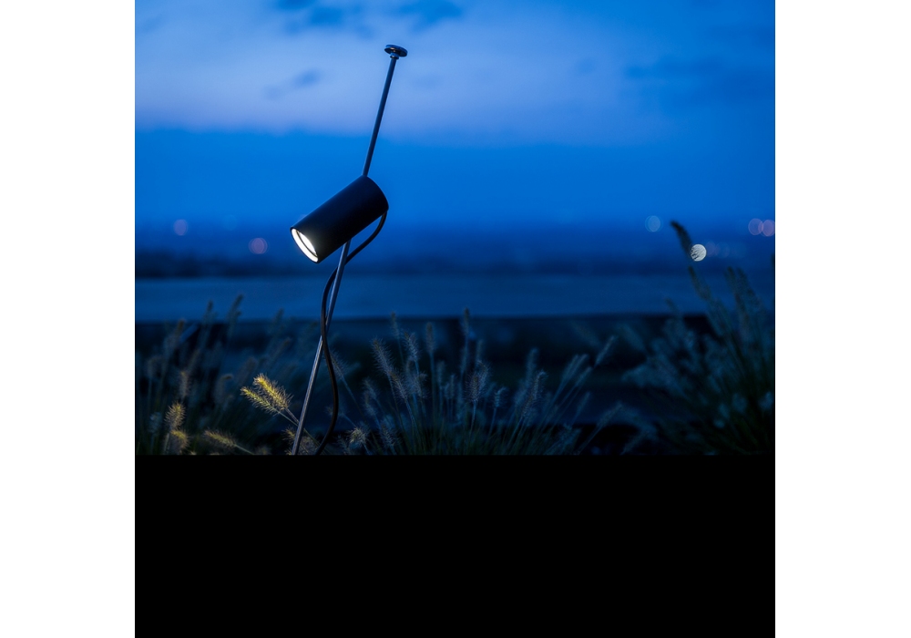 Grillo designed by Daniele Sprega for Davide Groppi is an outdoor floor lamp structured in matt black painted metal and stainless steel. The spot adopts a dimmable LED light source in different gradations of light.