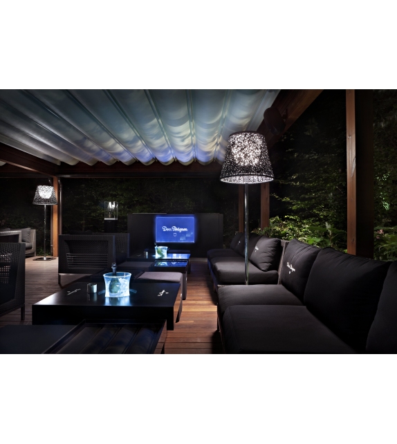 KTribe F3 designed by Philippe Starck for Flos is an outdoor floor lamp with a quadrangular base and an aluminum rod treated with a galvanic process. The lampshade is in fabric with a polycarbonate supporting structure. Remotely adjustable (dimmer not included). Bulb not included.