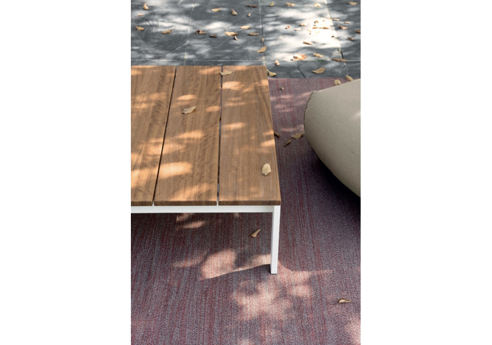 Be-Easy Slatted designed by Bluezone for Kristalia is an outdoor coffee table with steel legs and a slatted aluminum or teak top. Available in different finishes and dimensions.
