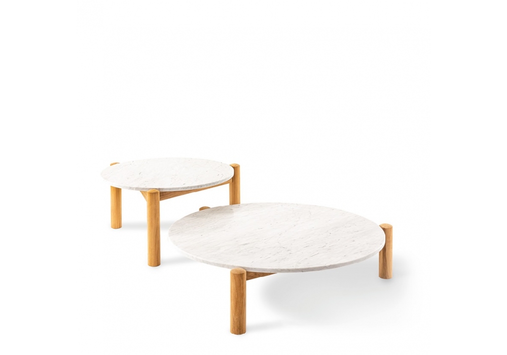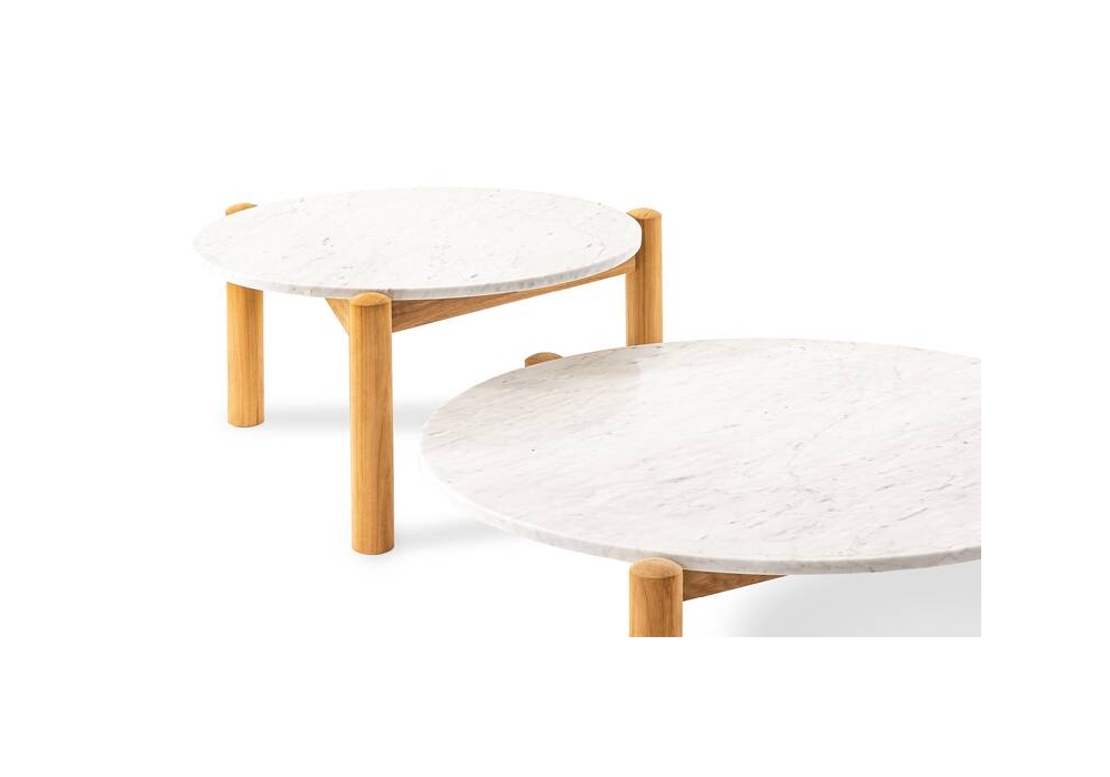 Table à Plateau Interchangeable designed by Charlotte Perriand for Cassina is coffee table with structure of the base made up of three circular section legs in teak wood, joined by three crosspieces on which the table top, in Carrara marble. Available in 2 sizes.