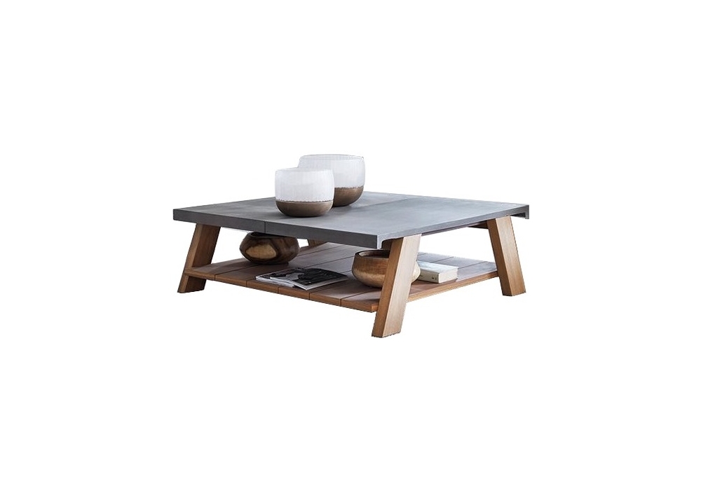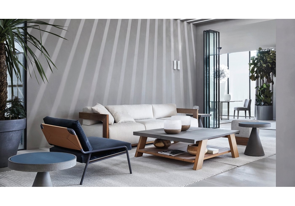 Joi Open Air designed by Andrea Parisio for Meridiani is a collection of outdoor tables with structure in solid iroko with protective varnish and top in fiber reinforced UHPC in light gray finish with water proof protective treatment.