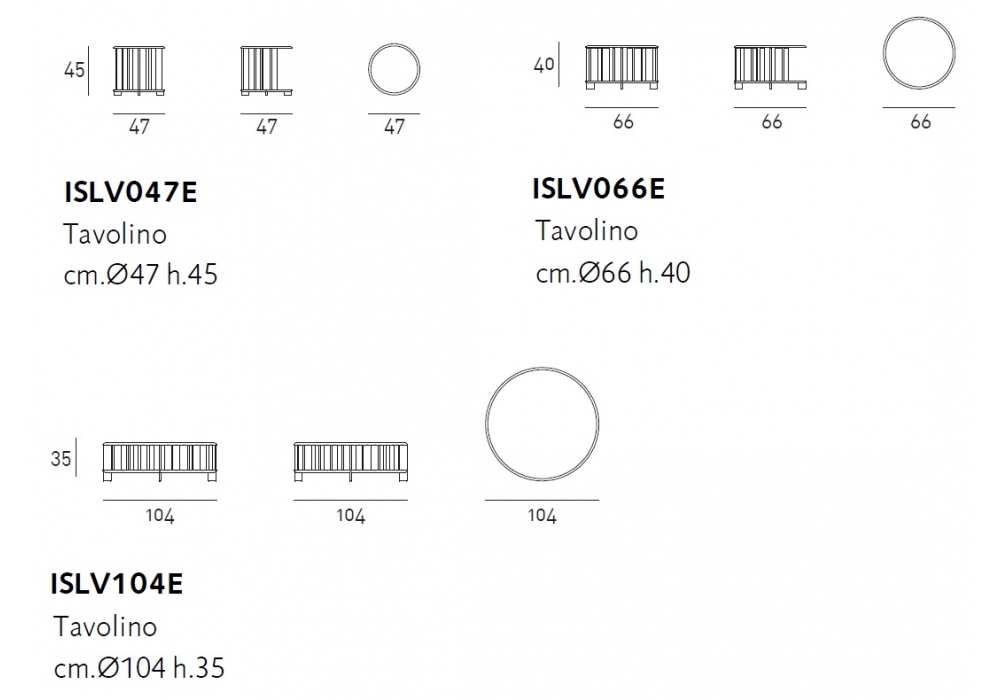 | Dimensions | Ø 47 x H 45 cm; Ø 66 x H 40 cm; Ø 104 x H 35 cm. |