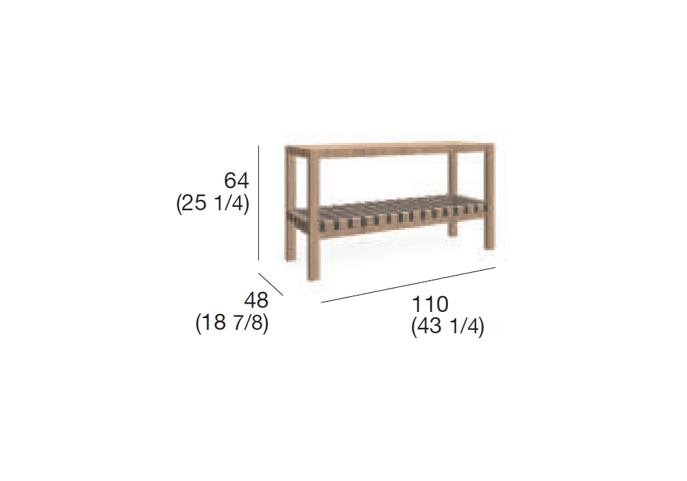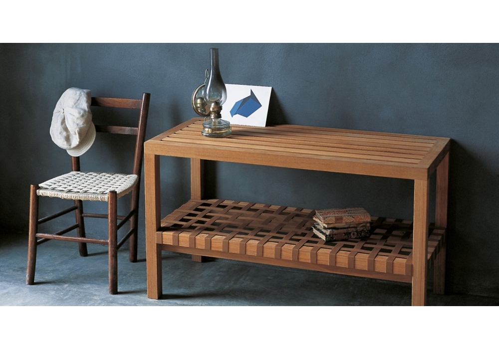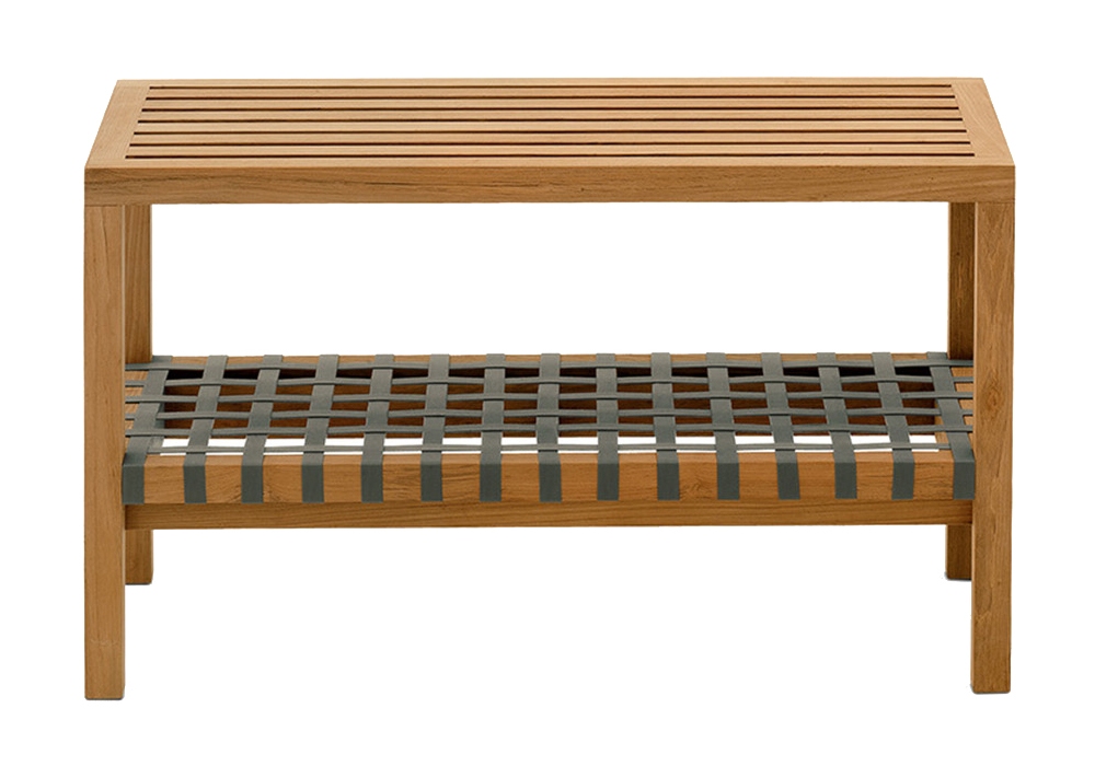 Network designed by Rodolfo Dordoni for Roda is an outdoor console made of teak with a lower shelf made of acrylic or polyester belts.