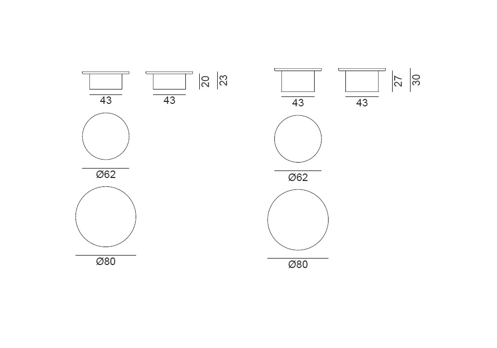 | Dimensions | Ø 62 x H 23 cm; Ø 80 x H 23 cm; Ø 62 x H 30 cm; Ø 80 x H 30 cm. |