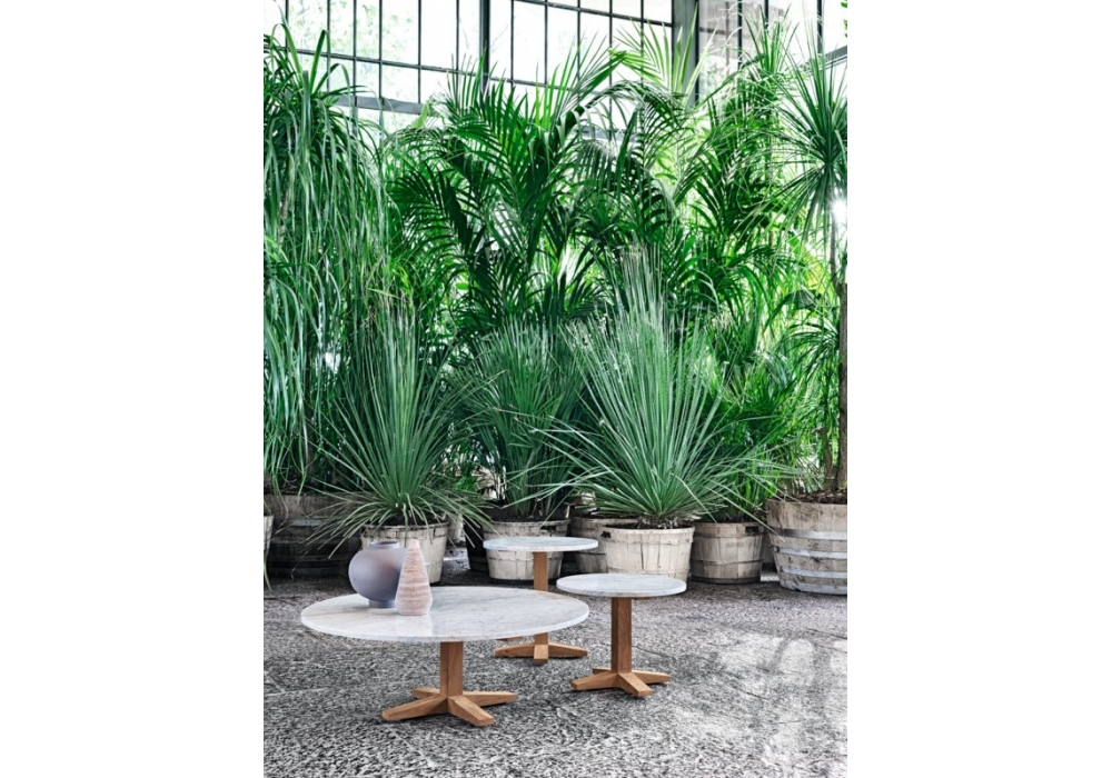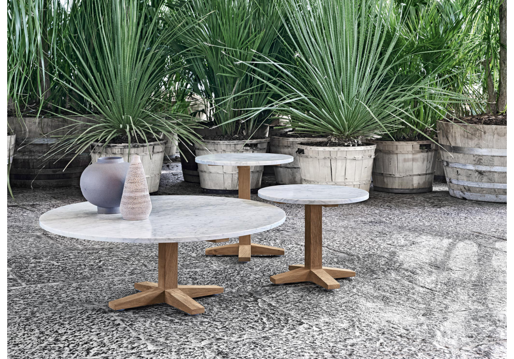 Jeko designed by Paola Navone for Gervasoni is a round coffee table made with structure in ECOTeak and top in white Carrara marble. Available in different dimensions.