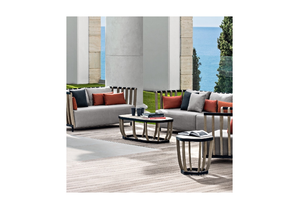 Swing Round designed by Patrick Norguet for Ethimo is a circular coffee table with structure in teak and painted aluminum. Swing Round is available in different finishes.