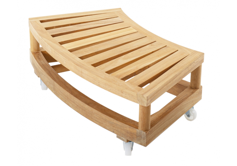 Pevero designed and produced by Unopiù is a semi-circular outdoor coffee table with wheels with teak wood trellis structure.