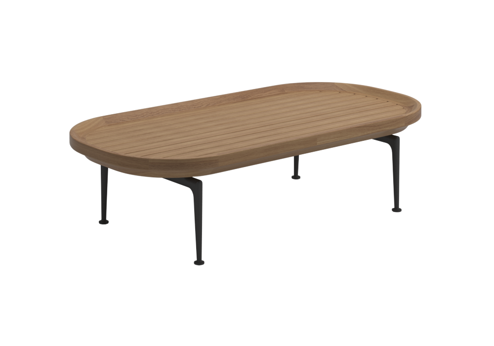 Mistral designed by Henrik Pedersen for Gloster is an outdoor coffee table made up fo metal frame and natural finish slatted teak table top.