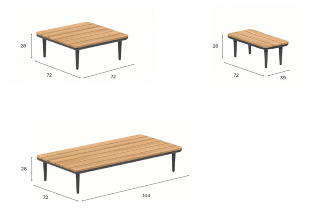 | Dimensions | - 72 x 72 x H 28 cm; - 72 x 39 x H 28 cm; - 144 x 72 x H 28 cm. |