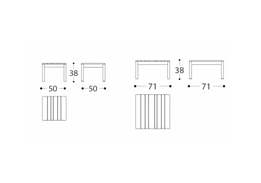 | Dimensions | - 50 x 50 x H 38 cm; - 71 x 71 x H 38 cm. |