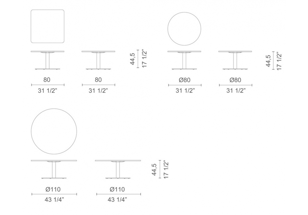| Dimensions | 80 x 80 x H 44.5 cm; Ø 80 x H 44.5 cm; Ø 110 x H 44.5 cm. |