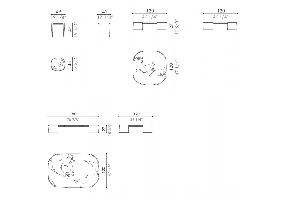 | Dimensions | 49 x 45 x H 49 cm; 120 x 120 x H 27 cm; 180 x 120 x H 27 cm. |