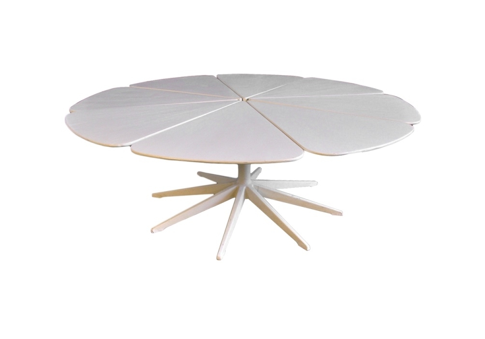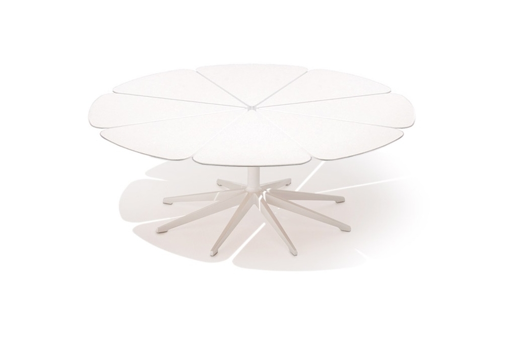 Petal designed by Richard Shultz for Knoll is an outdoor coffee table with a white powder-coated die-cast aluminum frame and a central leg in painted stainless steel. Top in white high-density polyurethane or teak.