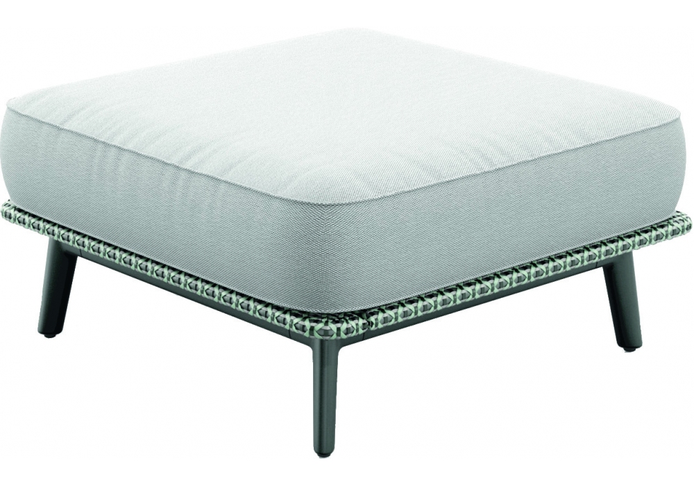 Mbarq designed by Sebastian Herkner for Dedon is a footstool in woven fiber over a powder-coated aluminum frame. The cushions are comfortable and available in different finishes.