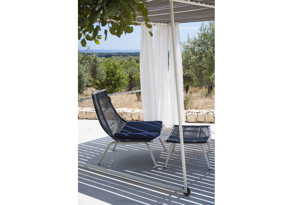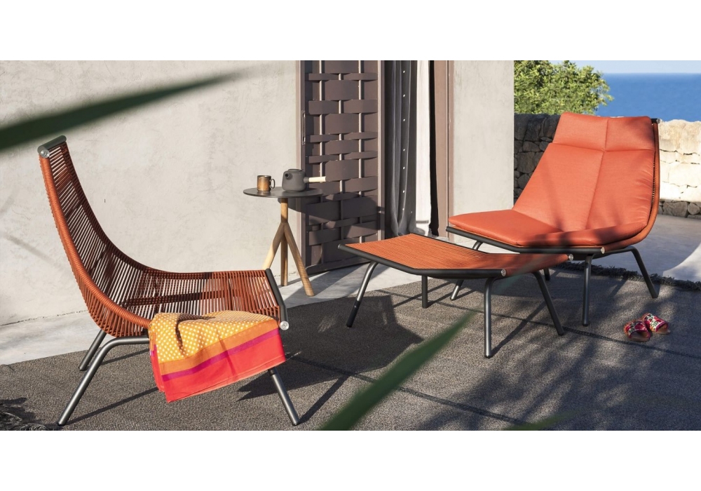 Laze designed by Gordon Guillaumier for Roda is an outdoor footrest with powder coated stainless steel structure and top made of polyester or acrylic cords.