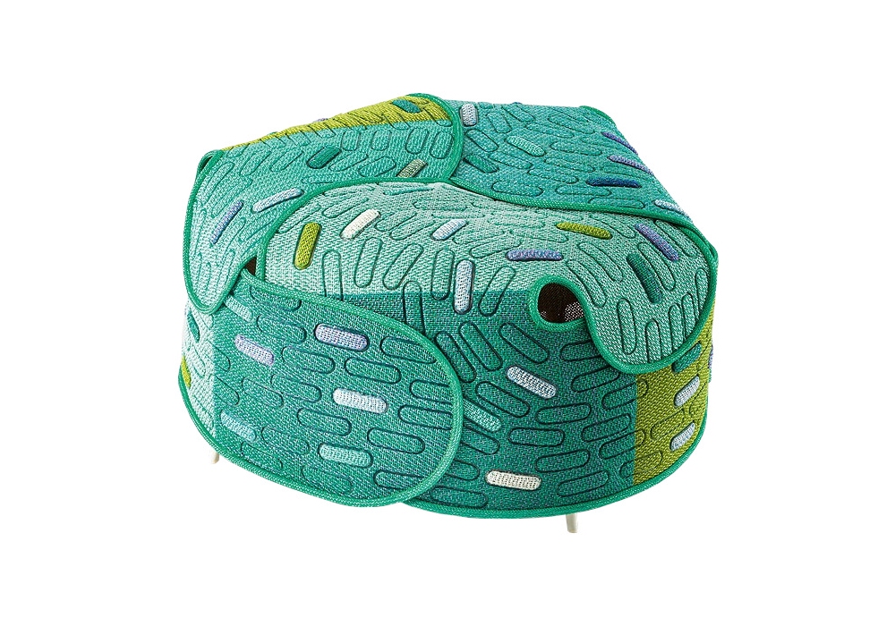 Hana-arashi / Mottainai designed by Nendo for Paola Lenti is a pouf with internal structure in glossy painted stainless steel complete with elastic straps and plastic tips. Seat mat in polyurethane with fixed internal covering in spaced polyester fabric and removable external covering in Maris fabric. Pairing colors generates different color results each time. Suitable for outdoors.