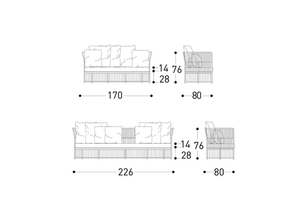 | Dimensions | - 170 x 80 x H 76 cm; - 226 x 80 x H 76 cm. |