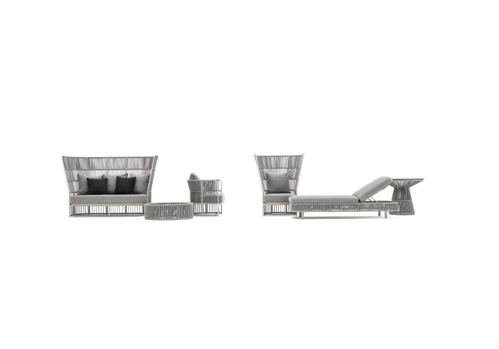 Tibidabo designed by Calvi & Brambilla for Varaschin is a high back sofa with powder coated aluminum frame with woven synthetic fiber upholstery. Feet in polypropylene. Removable cushions. Available in different finishes.