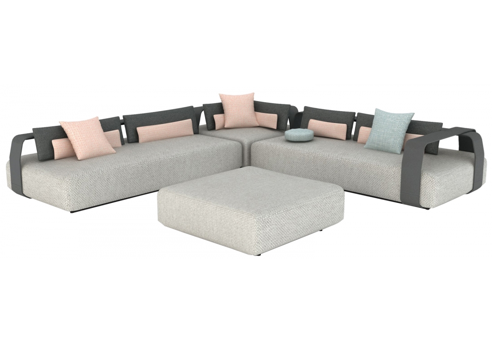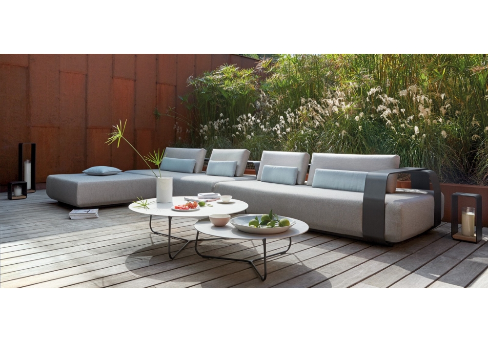 Kumo designed by Lionel Doyen for Manutti is a sofa with aluminium structure and upholstery in fabric. The armrests and back supports are easily adjustable and can be moved around. Kumo invites you to create a personalised outdoor cocoon. Available in different finishes.
