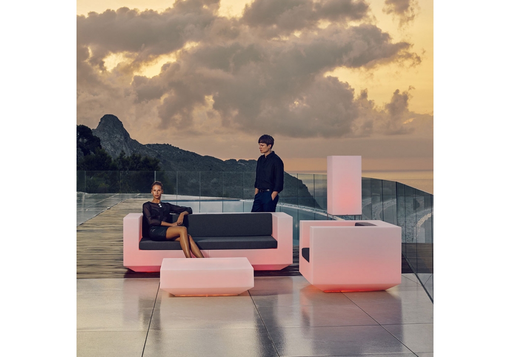 Vela designed by Ramón Esteve for Vondom is a sofa made in polyethylene resin by rotational molding and fabric covering. 100% recyclable. Suitable for indoor and outdoor use. Available in different finishes.