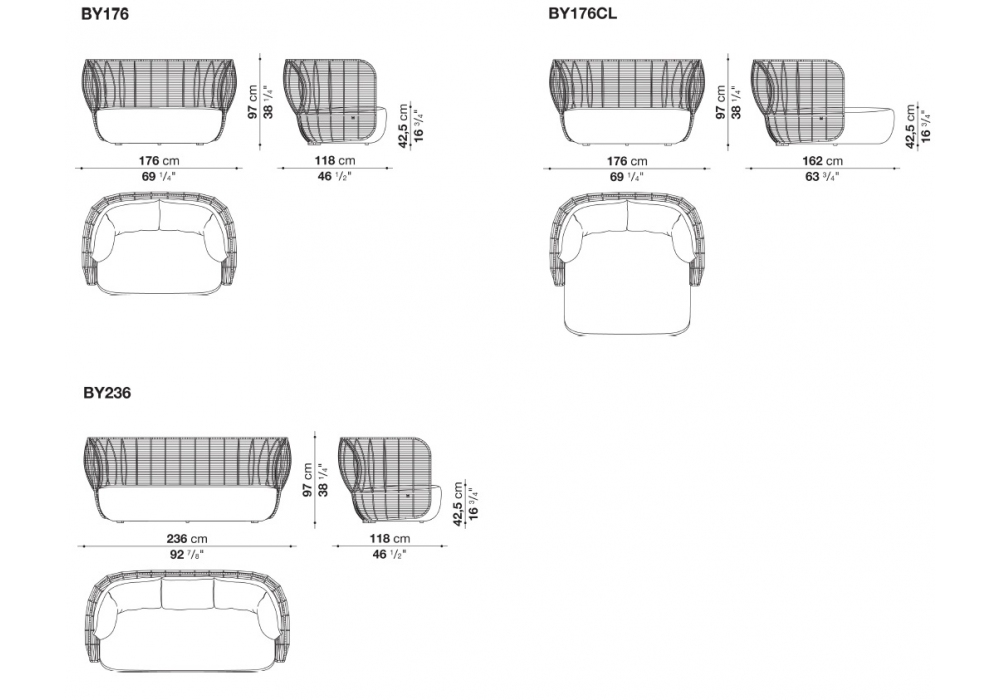 Bay designed by Nipa Doshi & Jonathan Levien for B&B Italia Outdoor is a sofa with shell anthracite or tortora polypropylene interlacing and upholstery in different fabrics. Available in two dimensions.