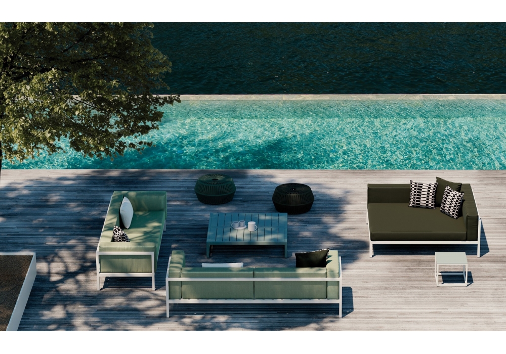 Landscape produced and signed by Kettal Studio is a modular sofa with a painted aluminum frame while the padding is covered in fabric. Landscape is available in different finishes and sizes.