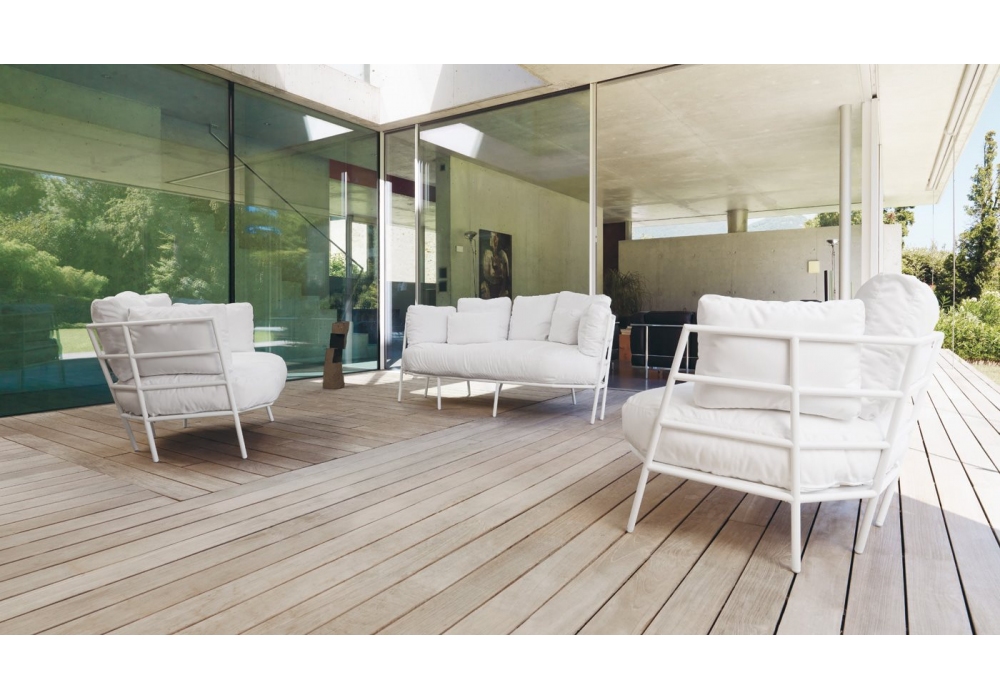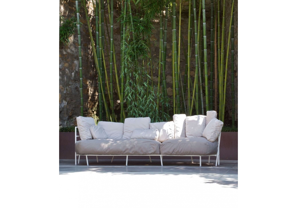 Dehors designed by Michele De Lucchi for Alias is a sofa for the outdoor with a painted steel structure and seat covered in removable fabric. The cushions are included.