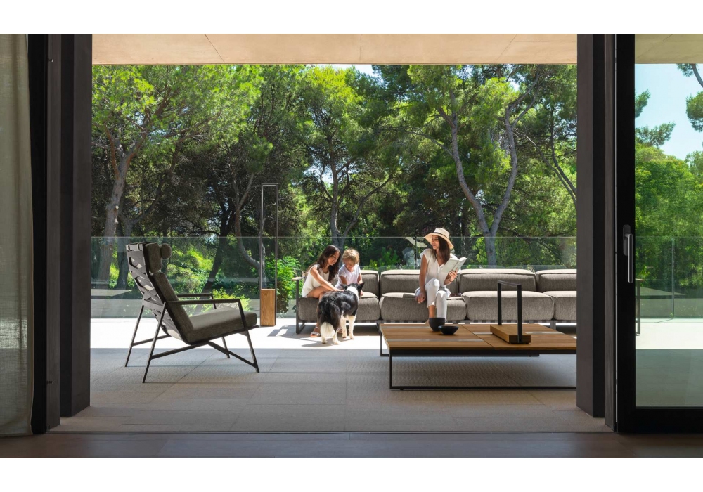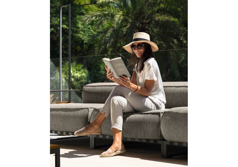 Casilda is a modular sofa designed by Ràmon Esteve for Talenti, with the variety of materials and shapes of the different modules making the range of composition possibilities very vast. Consisting of a powder-coated metal frame, Casilda finds its identifying marks in the polyester straps that are spaced along the structure and in the large fabric-covered cushions. Thanks to its essential style, it is able to fit into any type of environment, enriching it with its contemporary charm.