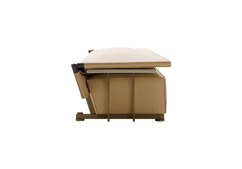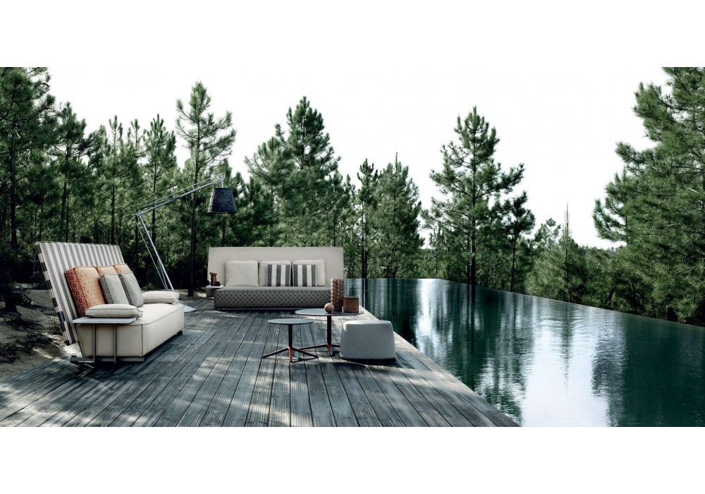 Oh, it rains! designed by Philippe Starck for B&B Italia Outdoor is an outdoor sofa with a bronze-finish aluminum frame, warm gray anodized aluminum hinges. Upholstery in different fabrics.