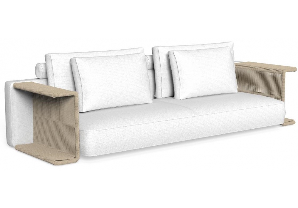 Cliff Dèco designed by Ludovica and Roberto Palomba for Talenti is a sofa with fabric backrest and armrests in aluminum covered in nautical rope in the finishes of the Cliff collection.