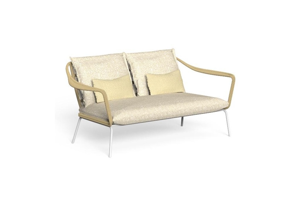 Cruise Alu Love Seat designed by Ludovica and Roberto Palomba for Talenti is a sofa with structure in synthetic rope that wraps the backrest and armrests, removable cushions with padding made of quick dry foam and covered with fabrics designed for waterproof outdoors.