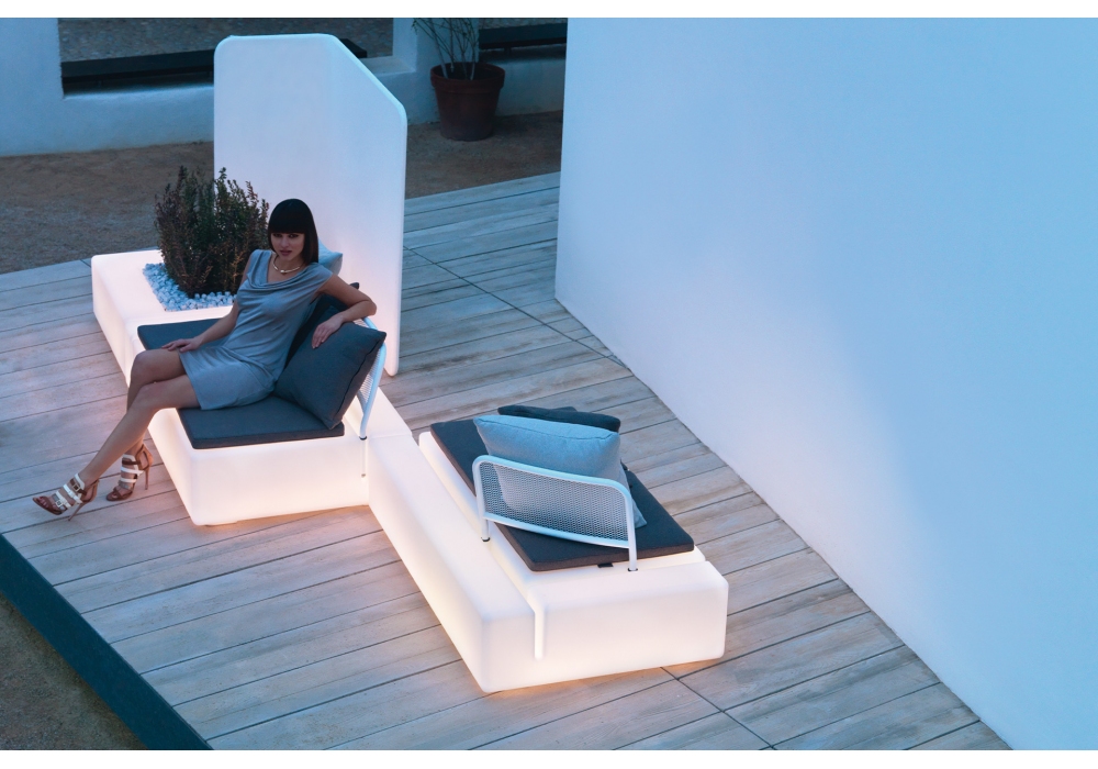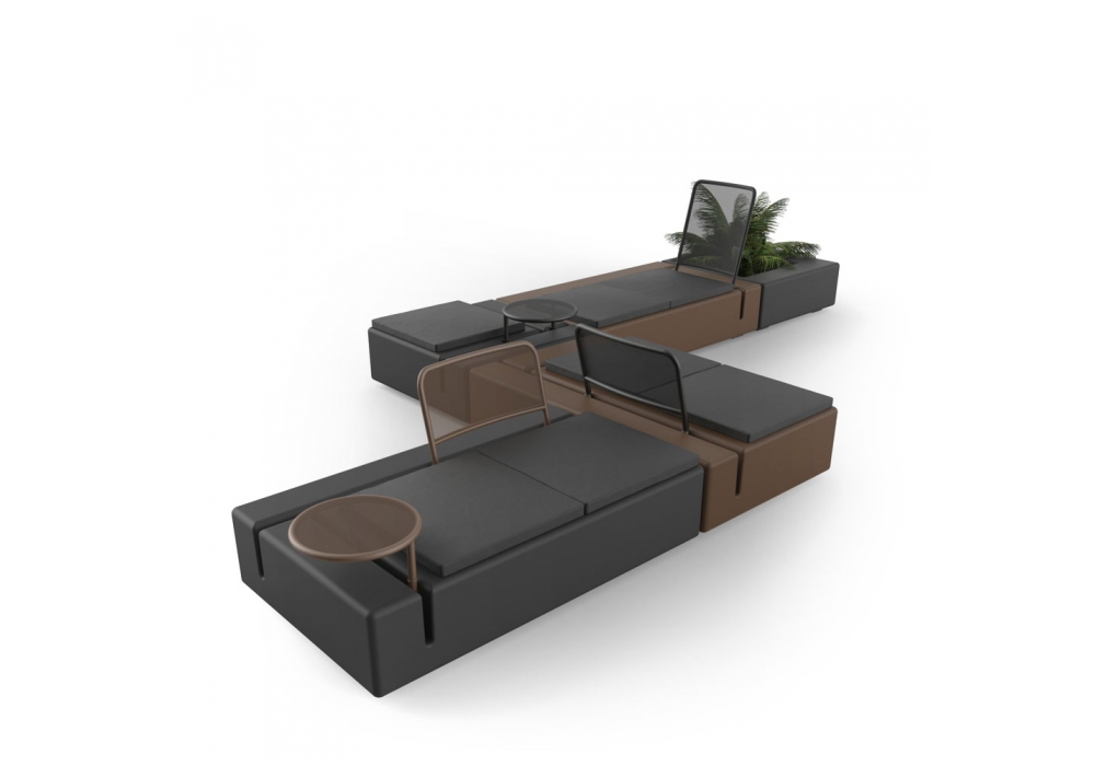 Kes designed by Gabriele & Oscar Buratti for Vondom is a modular seating system for furnishing outdoor spaces. The main objective is to create infinite and articulated compositions; linear and angular sofas, chaises and poufs. The most interesting feature of this project is the visible cut on the base part, which allows you to insert additional elements, such as backrests, armrests and tables.