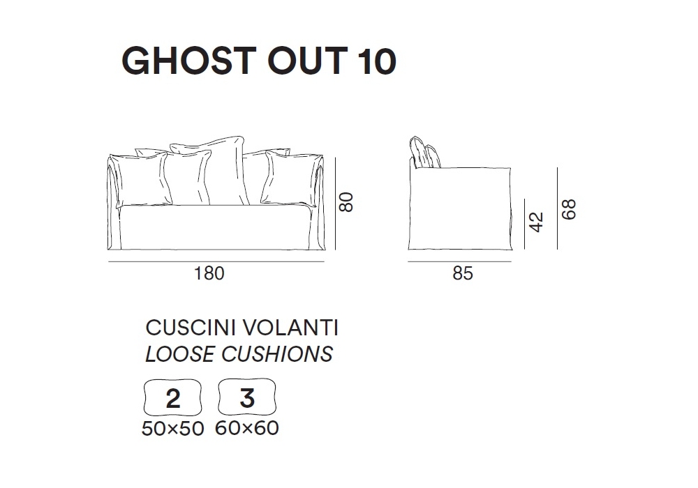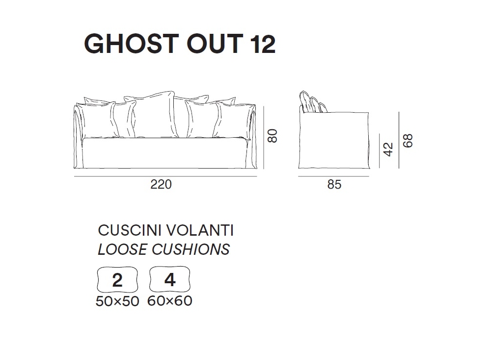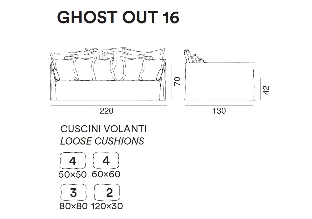 | Decorative cushions | Ghost Out 10_ Nr. 2 50 x 50 cm - Nr.3 60 x 60 cm; Ghost Out 12_ Nr. 2 50 x 50 cm - Nr.4 60 x 60 cm; Ghost Out 16_ Nr. 4 50 x 50 cm - Nr.4 60 x 60 cm - Nr.3 80 x 80 cm - Nr. 2 120 x 30 cm. |
