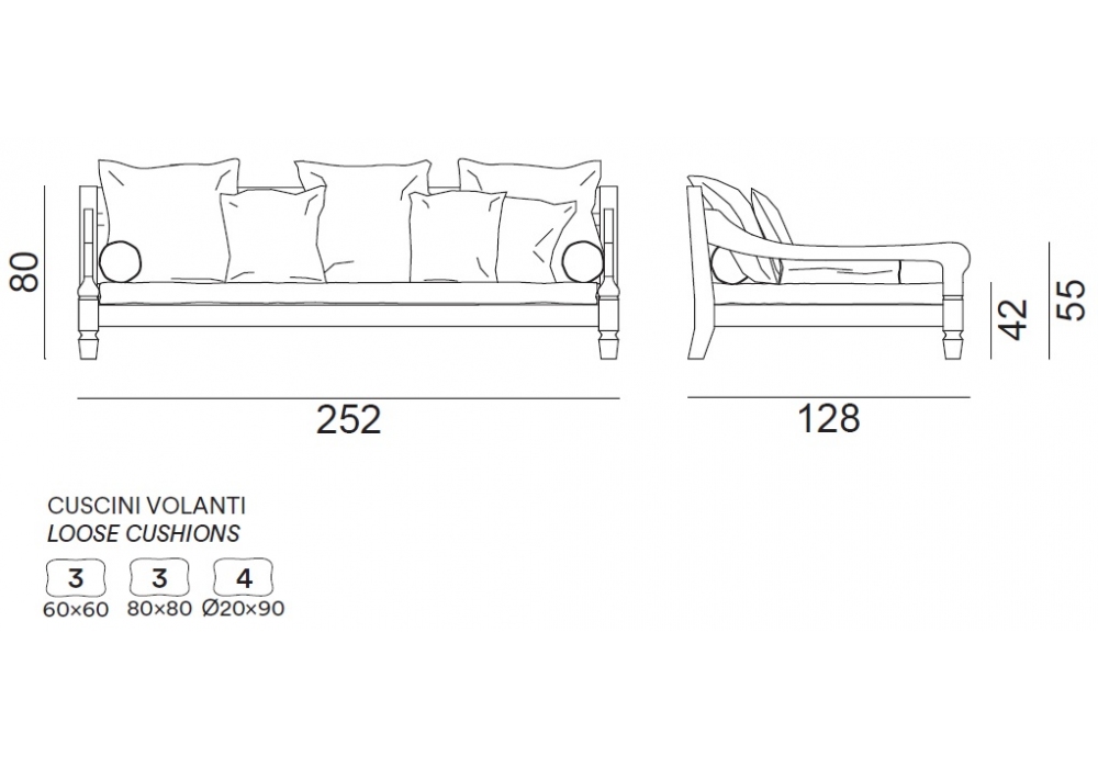 | Decorative cushions | Nr.3 60 x 60 cm; Nr.3 80 x 80 cm; Nr.4 Ø 20 x 90 cm. |