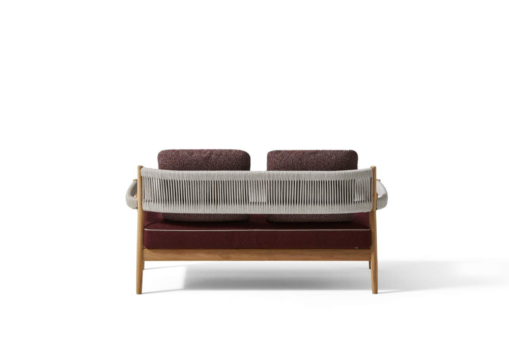 Dine Out designed by Rodolfo Dordoni for Cassina is a 2-seater small sofa for outdoors made with armrests and backrest strung in Orbettino rope and structure in solid natural teak wood. Fabric upholstery in different finishes. Seat cushions with contrasting gray grosgrain profile.
