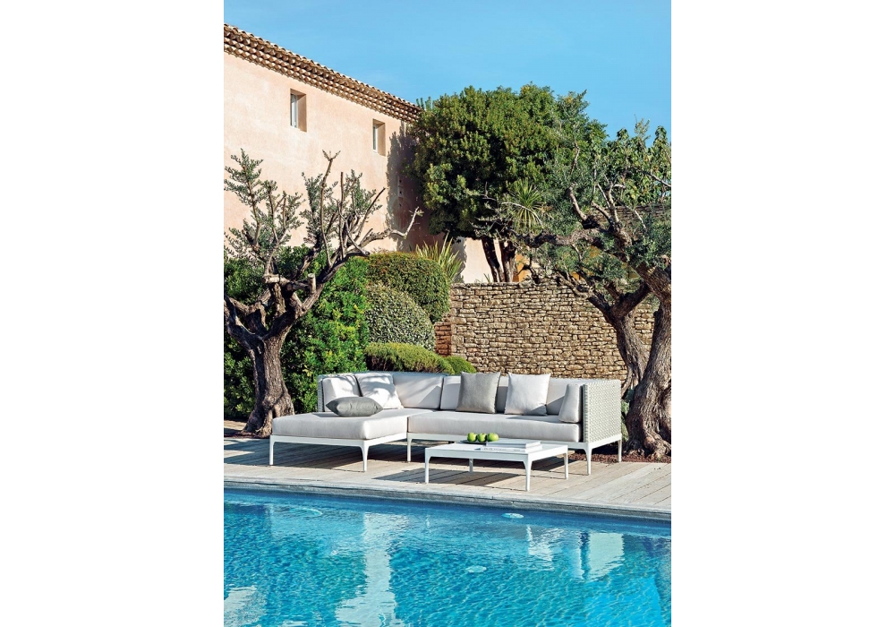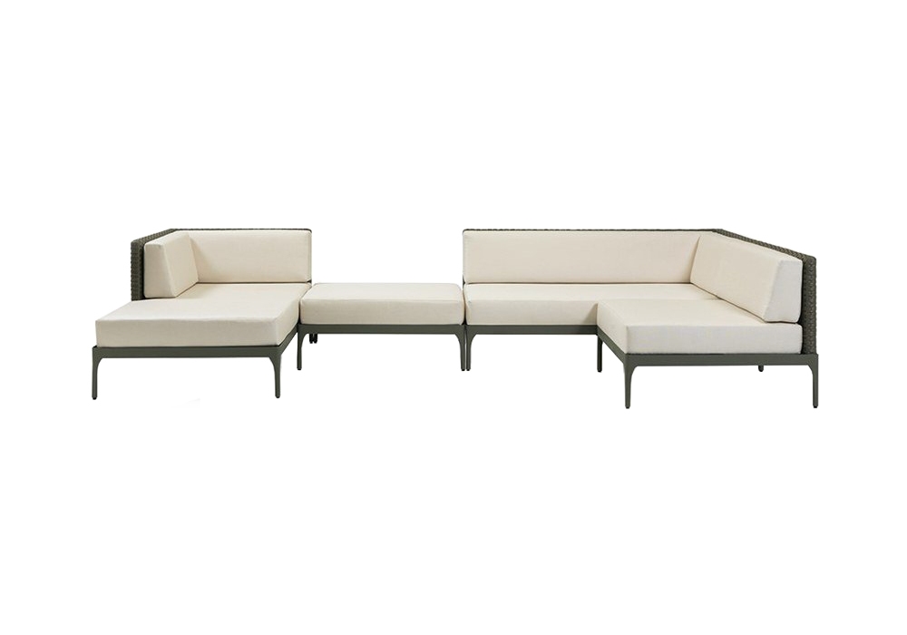 Infinity produced and signed by Ethimo is a modular sofa with painted aluminum structure covered with interweaving of lightwick. The cushions are in water-repellent acrylic fabric. Infinity is available in different finishes.