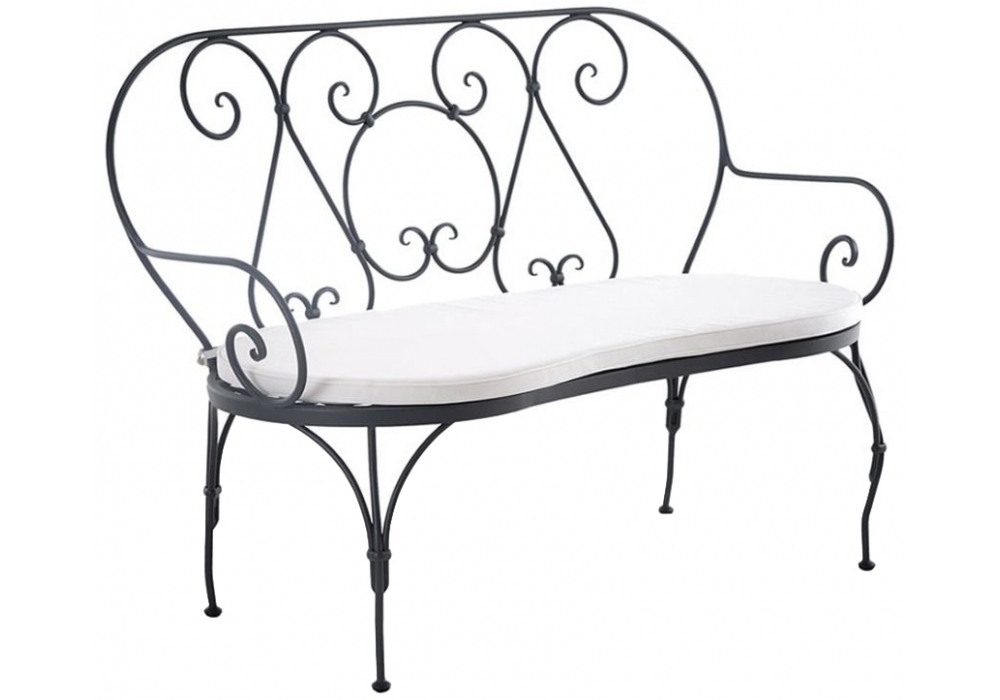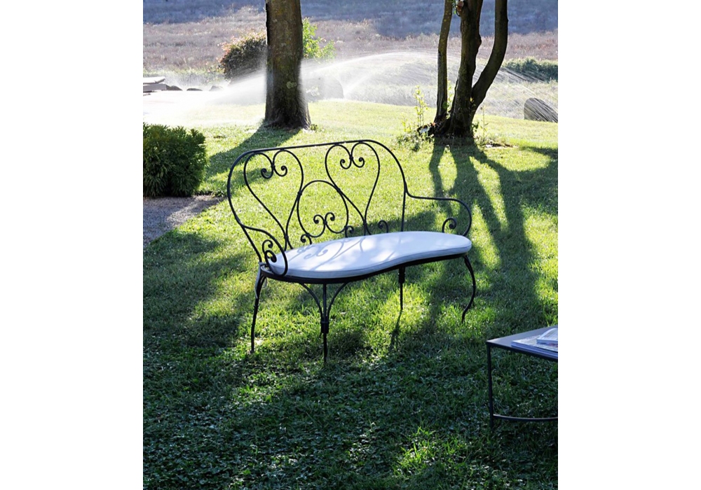 Aurora produced and signed by Unopiù is a small sofa with hand-forged iron structure painted in graphite color. The seat cushions are made of milk-colored acrylic fabric.